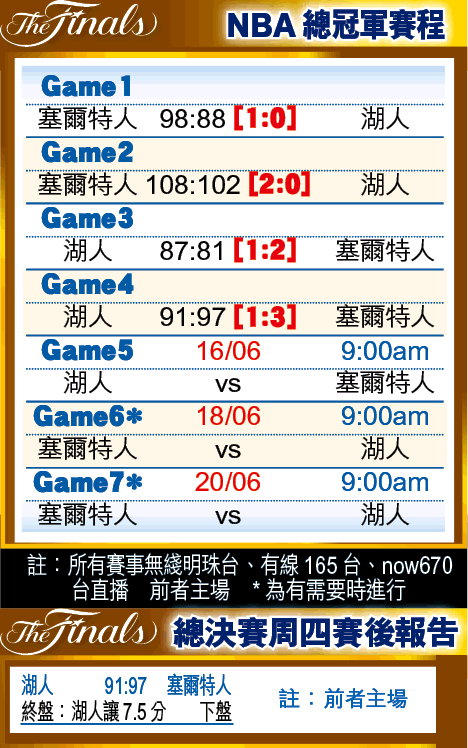 周四湖人於主場一度領先24分下,慘遭塞爾特人發威,上演自1971年以來,NBA總決賽史上最大的逆轉,終以91:97見負,現以場數1:3落後!總決賽史上從沒有球隊能夠在此劣勢下反勝封王,換言之湖人「登基」非常渺茫。