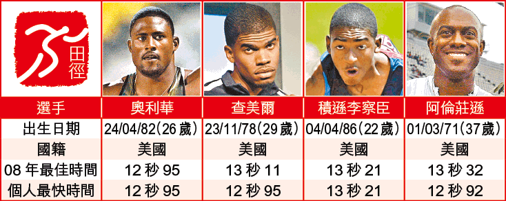 簡評:除羅布斯之外,一眾美國選手亦是劉翔衞冕京奧的障礙。當中以奧利華今年的狀態最好,造出08年第2快成績;而經驗老到的阿倫莊遜亦不容忽視。而查美爾及積遜李察臣亦是黑馬分子,故四面受敵的劉翔要在京奧中奪金絕不容易。