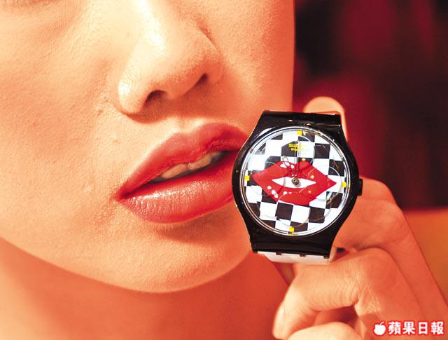 黑白棋盤襯迷人櫻唇造型,紅唇會隨時間轉動而浮現。