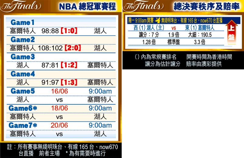 此外,加尼特(KG)在上周五記者會上的一番說話,也正正刺中了拜恩的神經中樞。KG說:「我們還未完成任務,但目標已越來越近了,我已能夠感受到冠軍的滋味。」正如湖人教練積遜表示:「這句說話大概會令拜恩受到很大刺激。」