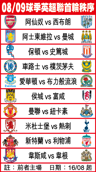 【綜合英格蘭外電】英超聯協會周一公佈08/09球季首輪聯賽秩序,衞冕的曼聯揭幕戰將在奧脫福迎戰紐卡素;而阿仙奴開季首兩輪抽得好籤,分別迎擊升班馬西布朗及作客富咸。至於由新帥史高拉利領軍的車路士,首仗將遇上去屆英足盃冠軍樸茨茅夫。