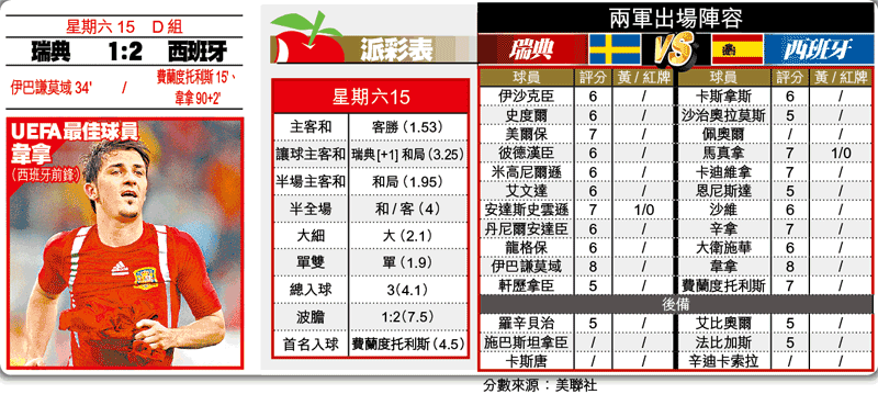 簡報 上半場15分鐘,西班牙雖憑費蘭度托利斯把握大衞施華的傳中射入,但其後未能擴大優勢,中堅佩奧爾更因傷退下火線;而瑞典憑伊巴謙莫域於34分鐘禁區內擺脫沙治奧拉莫斯射入,雙方以1:1完半場。下半場戰況膠着,不過西班牙大勇射手韋拿於補時階段的入球,帶領球隊取得勝利。 好睇指數:★★★ 註:以5★為最高