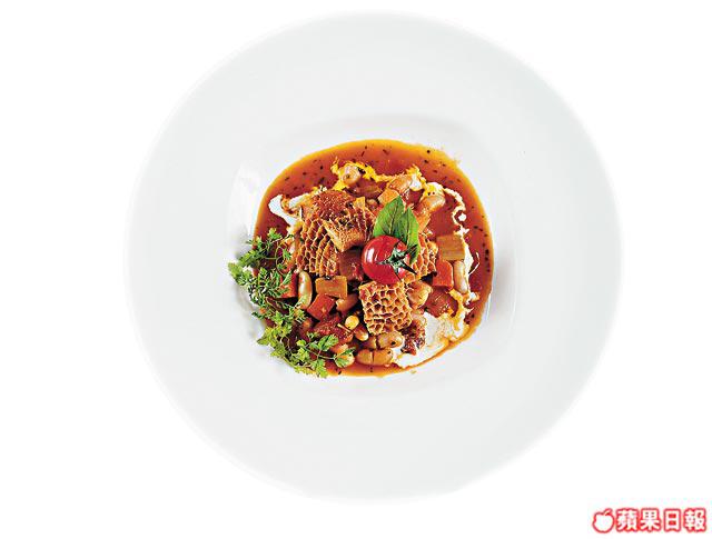 以低溫慢煮和牛胃3小時,再加意大利番茄、白豆和日本辣粉,入口清新酸辣。