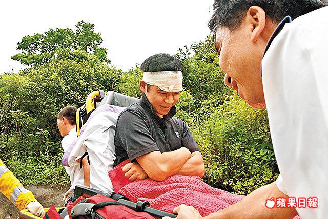 【本報訊】一名任職空中少爺的單車發燒友,昨日與友人在東涌騎單車往梅窩途中,在白芒一條小橋上失事,空中少爺連人帶單車跌進小溪,幸而溪水不深,他僅撞穿額頭輕傷,事後由消防用擔架抬下山送院。他見到記者拍攝表示:「好瘀呀!」