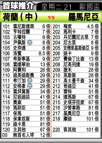 「讓球」羅馬尼亞讓平/半,捧上盤;而荷蘭在對上5場歐國盃分組賽,有4場是於半場領先,可見愛於上半場搶攻,球迷可留意3.6倍的荷蘭半勝,兼冷敲20倍的「主/客」。