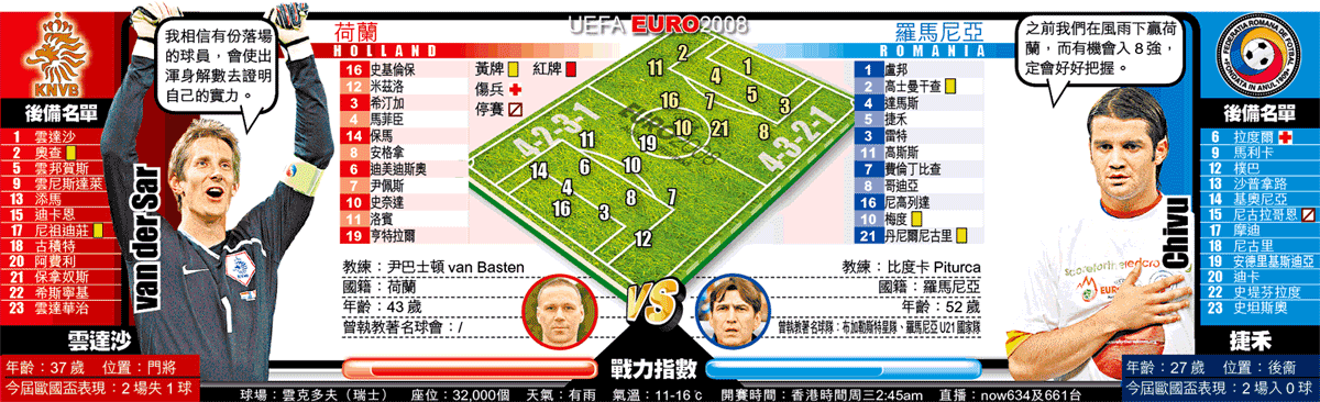 荷蘭與其他15支參加隊一樣,今仗是他們在8日內第3場分組賽,加上之後要於周六打8強戰,故今仗收起雲達沙、雲邦賀斯、雲尼斯達萊等年過30或拼了兩場的球員,亦屬合理。而即使他們以對意法的原陣對羅馬尼亞,惟手執8強入場券料影響作戰心態;加上怕受傷的情況下,不相信他們可踢出頭兩場的水準。