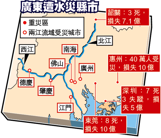 廣東省防汛抗旱總指揮部數字顯示,截至前日晚,廣東全省21個市、88個縣(區)、752個鄉(鎮)、536萬人受災,倒塌房屋4,812間,因洪澇災害死亡20人,直接經濟損失37.9億人民幣(下同)。受災最嚴重的是惠州、韶關、東莞和深圳等地,珠三角面臨異常嚴峻的抗洪壓力。當局前日啓動三級應急響應。此外,與廣東相鄰的廣西,亦有逾680萬人受災,經濟損失逾37億元。