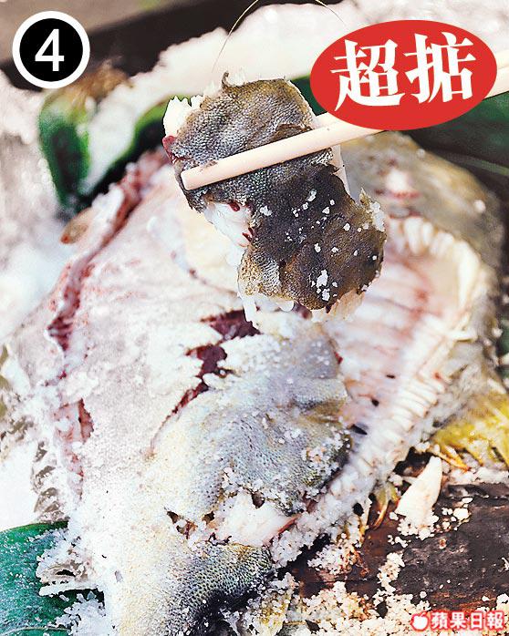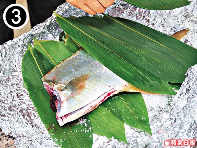 以鮮竹葉包住魚身,鋪滿鹽,用錫紙包好,每邊燒約10分鐘。