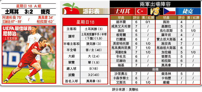簡報 土耳其繼擊敗瑞士後,上演了更戲劇性的絕地反擊,3:2壓倒捷克取得了出線席位。捷克上半場憑真高拿的入球取得領先,下半場更由柏拉斯擴大比數。及後土耳其阿達杜倫將比數拉近至1:2。完場前3分鐘,土耳其射手尼赫治把握對方龍門及後防的大意犯錯梅開二度,卒完成了奇迹的反勝。 好睇指數:★★★★★ 註:以5★為最高