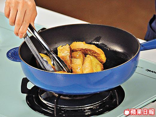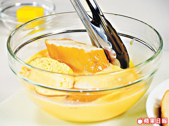 囗起鑊以慢火燒溶牛油,放蛋漿麵包煎至兩面金黃撈起,用吸油紙吸去油份。