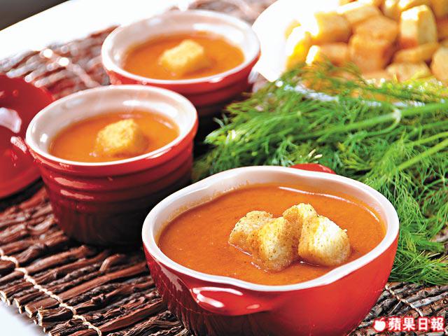 囗將煲好的湯料放入攪拌機,加入番茄及茴香葉碎打滑,再倒入煲用中火煮滾,食時伴麵包脆粒便成。