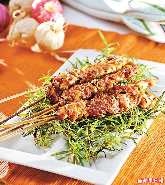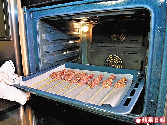 囗將豬肉串放在鋪有牛油紙的焗盤上,放入已預熱焗爐,以200℃焗20至25分鐘便成。