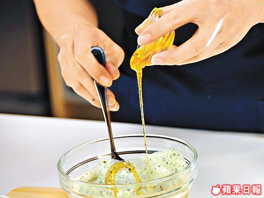 醬汁料:薄荷醬2湯匙、鮮乳酪100毫升、蜜糖11/2湯匙、蛋黃醬3湯匙、鹽/黑椒碎各少許