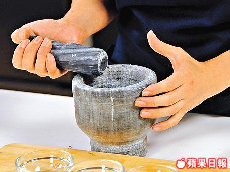 囗將蒜茸、鹽、糖、辣椒粉、迷迭香及胡椒碎放入石杵內樁碎,之後加欖橄油及檸檬汁攪勻。