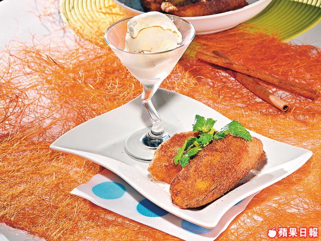 法國麵包2/3條、蛋3隻(拂勻)、奶350毫升、呍呢拿油2茶匙、牛油2湯匙、糖1/2杯、肉桂粉1湯匙、雪糕適量