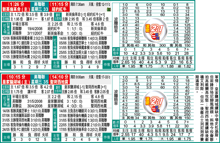 革命於周三迎紅牛時,有射手泰威文因足踝受傷缺陣,但代替他的基利杜比表現甚佳,近5場入4球;而他的前鋒拍檔基斯文最近腳風亦順,近3場入2球,配合中場主力拉斯頓等質高球員,革命勝望頗濃。