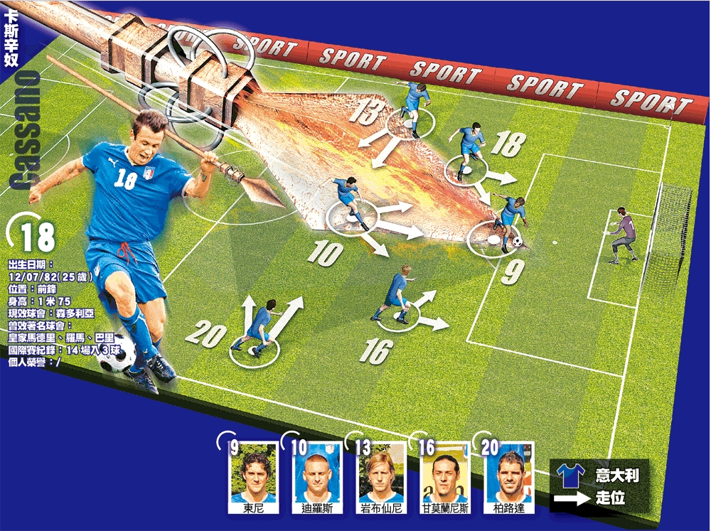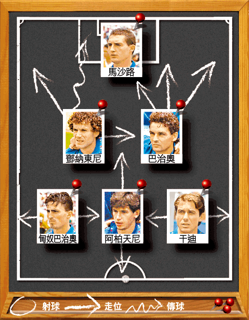 94年世界盃亞軍意大利,曾在8強時與今仗對手西班牙對壘,其時已具「長矛陣式」的雛型。當時單箭頭是馬沙路或卡沙拉基,支援他們的是「神奇小馬尾」巴治奧及今日意軍的教練鄧納東尼或薛洛尼;3名防守中場分別是阿柏天尼、甸奴巴治奧及干廸,與今屆意軍排出的3防中陣式如出一轍。當屆,意大利憑兩位巴治奧分別建功,以2:1淘汰西班牙出局,今日可會出現翻版戰果?