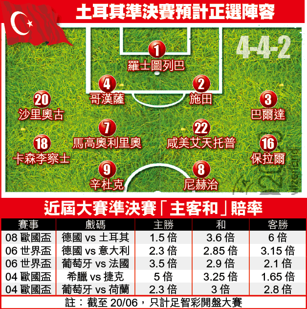 導致這個懸殊的賠率,主要是土耳其陣容不整。該隊面對德國時,既比對手休息少一天,加上激戰120分鐘,體力已較對手輸蝕;而且今仗再有端基、阿達杜倫及艾斯克累積兩面黃牌停賽,門將廸米雷仍要坐波監,泰林只好寄望傷兵施田、安利等可及時復出,可幸防中馬高奧利里奧停賽期滿復出。