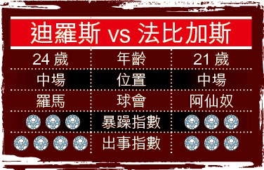 同樣,中場對手法比加斯也甚鬱悶,阿仙奴今季兩手空空,來到歐國盃決賽周,也因巴塞隆拿勢力壟斷,中場主力位置讓予沙維和恩尼斯達。因此。法比加斯與廸羅斯這對火遮眼的年輕球員碰頭,不難重現當年泰索廸與安歷基的歷史血案。