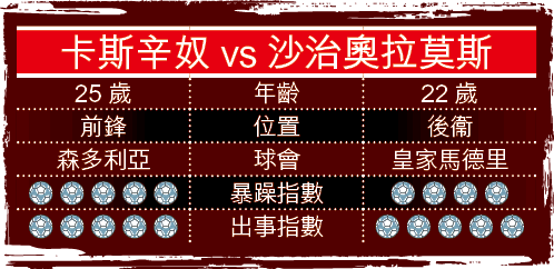 卡斯辛奴出任左前鋒,今仗將面對前皇馬隊友沙治奧拉莫斯。該後衞本屆賽事水準差勁,成了西班牙傳媒攻擊目標,相信儲存了不少火藥。因此,今仗與前皇馬「邊緣少年」卡斯辛奴相遇,很可能變成水溝油,成為《第一滴血II》的兩大主角。
