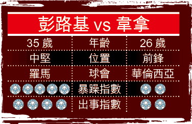 韋拿是西班牙利矛,彭路基則是意大利堅盾。本屆賽事簡拿華路缺陣,彭路基首仗對荷蘭的下半場移中,此後更成防線指揮官。然而,該35歲球員速度與轉身皆不如當年,周日對韋拿的快速打法頗吃力,加上小動作多多,很可能挑起火頭。