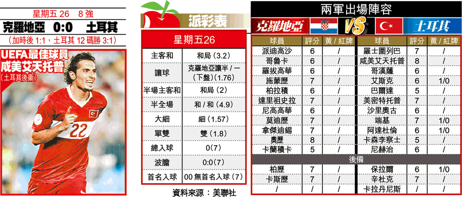 簡報:土耳其再次飾演「逆境王」,在加時追平克羅地亞1:1後,再憑12碼氣走對手。雙方於法定時間內皆未有紀錄,令比賽進入加時。然而好戲在後頭,加時下半場卡斯歷取得入球,但土軍憑辛杜克最後一射奇迹扳平。到互射12碼階段,克軍先後有莫廸歷、拿傑廸錫及柏歷射失,土軍在3球皆中下晉級。 好睇指數:★★★★★ 註:以5★為最高