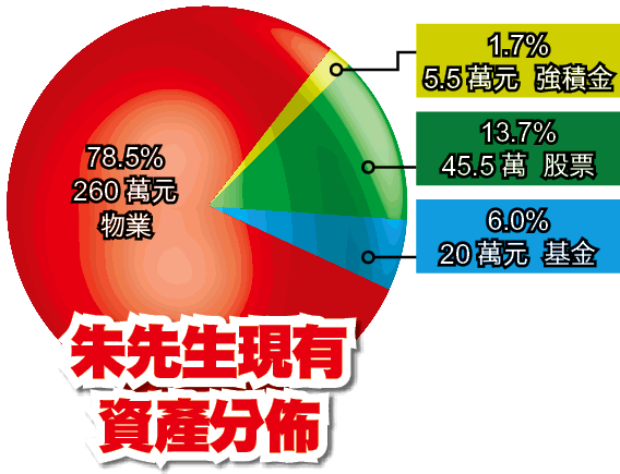 資產:現金5萬、股票45.5萬、基金20萬及物業260萬,強積金5.5萬,另每月可額外投資3000元