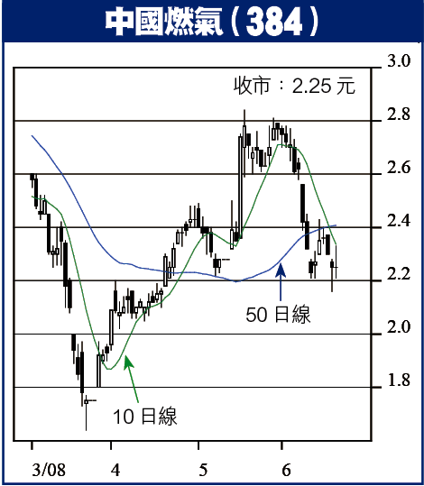 覆讀者May:中國燃氣上日平收2.25元,閣下賬面損失兩成,平均線下移加強了下調壓力,反彈料受制於2.35至2.50元,暫乏條件向上。日內很大機會下試2.16元,此支持位不容有失,否則可能下試1.80元,宜考慮以2.10元作止蝕位,伺機沽出換馬。
