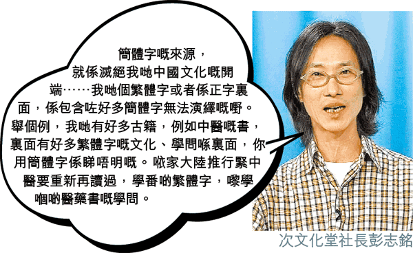 彭:文化,係應該畀個社會慢慢積累返嚟,你唔可以一個人用暴君式嘅行為,去將個文化打殘或者摧毀……應該係畀人民去帶動個文化轉變,而唔係某啲政治人,用佢哋手段,去迫令啲人民,將個文化扭曲,或者將啲文化逆轉……鄧小平都講咗樣嘢,就係所有領導人,出嚟題字簽名,都必然寫番繁體正字。點解佢都要咁講呢?佢都明白到,若果一下子全盤撐呢啲簡體字,中國文化就會死亡,甚至乎係一種國寶嘅殲滅。