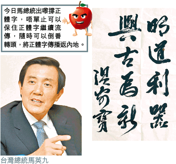 啱啱上任做咗台灣總統嘅馬英九,上星期喺一個會議表示,鼓勵台灣旅遊業界盡量使用正體字,要「讓他們(大陸觀光客)去適應我們,不是我們去適應他。」馬總統上任後,堅持保護正體字。面對中國嘅經濟力量,都難得地有咁嘅堅持,睇嚟正體字喺可見嘅將來,都唔會成為「文化遺產」……
