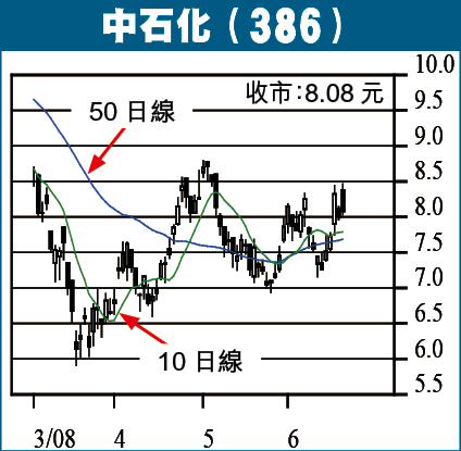 由於中央調高成品油價格,有利於石化雙雄,尤其是中石化,而從上周五的買盤亦可看到此點。上周五中石化的交投量高達41億餘元,乃當日成交量最高的股份。中石化並非滙控(005)、中移動(941),在10大成交榜中排頭位,並不常見。同時其成交股數更逼近去年10月時的高峯水平,反映這次真有龐大買盤跟進。此外,上周中石化以大成交一舉衝破50日及100日等中期平均線,若穩守8元水平,則後市可望進一步挑戰250日線9元水平。