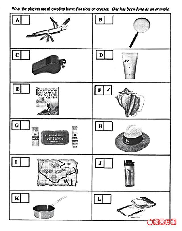 高考英語運用聆聽試(卷A)4月5日舉行,其中第六題一段對話錄音,內容關於《SurvivalHongKong(香港生還者)》遊戲的規則,答題指引只着考生「Putticksorcrosses」(用囗或X)選出參賽者可攜帶那些物品到荒島,沒有說明須用囗代表可以攜帶,X代表不可。