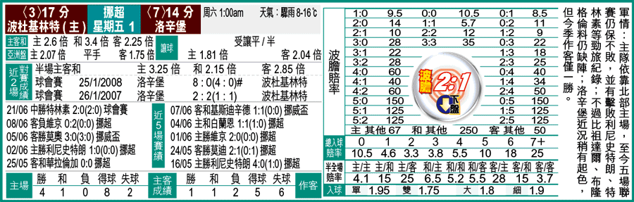 隨着歐國盃完結,北歐聯賽亦重燃戰火;周五挪超聯進行獨腳戲,由波杜基林特主場對洛辛堡,以波軍「極北」主場,加上洛辛堡今季作客表現差勁,客軍讓平/半當然博下盤。〈球賽編號:星期五1;波杜基林特vs洛辛堡〉牽牛