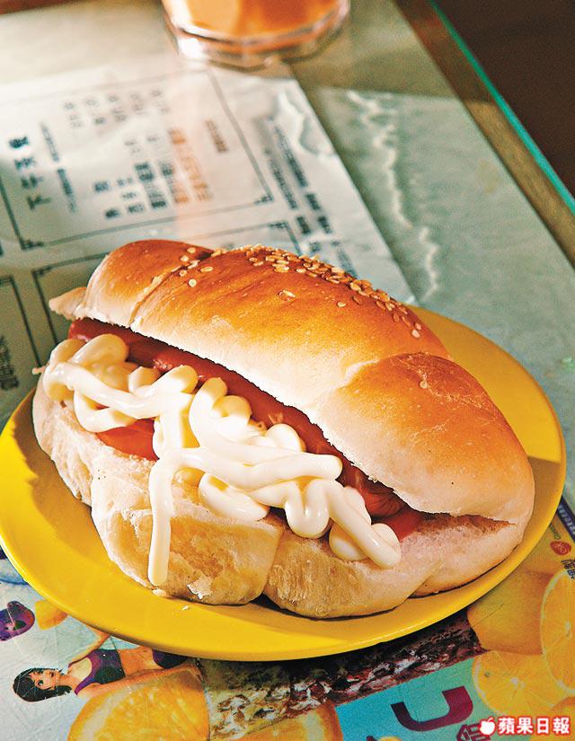 自製的芝麻包變成熱狗包,配熱狗腸、番茄及大量沙律醬。