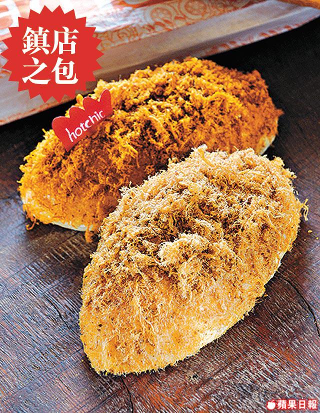 每日賣近400個,麵包塗滿甜的鬆鬆醬,肉鬆有辣有唔辣,仲有雞和豬之分。