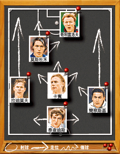 蘇聯解體後,俄羅斯於96年首次打入歐國盃決賽周,當時雖不是打4人防線,但中前場攻守模式與今屆頗為相似。該屆的「10號仔」莫斯杜禾,角色與本屆「10號仔」艾沙維作用相若,又是可打前鋒或後上的進攻中場,是全隊的核心;最前線由哥利雲洛夫攻堅。右路有簡察斯基快放,中路有卡賓,左路則有拉廸莫夫,而一人防中多由泰查廸斯擔任。