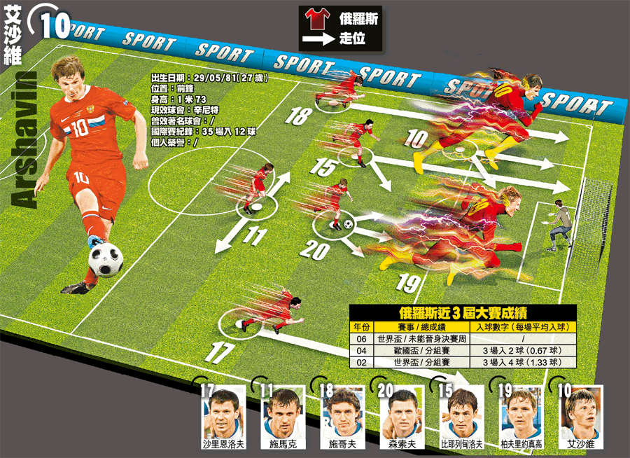 俄羅斯採用4-1-3-2陣式挑戰歐國盃,而有艾沙維在陣、與沒有艾沙維在陣時效果相距甚大。這名辛尼特射手首兩戰因停賽無緣披甲,致整隊活力欠奉,更直接令最前線的柏夫里約真高顯不出身價;但當艾沙維對瑞典復出,即令以行軍快速的俄羅斯復蘇過來,柏夫里約真高入球亦相對增加。直到8強,俄羅斯憑體力化兼高速踢法,將荷蘭全能足球完全瓦解,證明快速戰術極奏效。防中雖僅由隊長施馬克一人擔任,惟予人一夫當關之感;森索夫中路派牌,比耶列甸洛夫及沙里恩洛夫左右開弓,威力巨大。最重要是擅於左路發難的艾沙維,能完全帶動整支球隊。文:畢傑