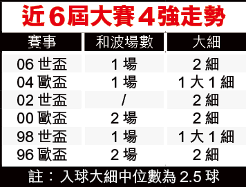對上6屆大賽4強的入球大細方面,12仗共開了10「細」2「大」(見附表);無怪乎足智彩在淘汰賽一直把「細」的賠率壓得非常低,此役「細」為1.57倍。賭錢為求贏,無論多少也該考慮其中,D加「細」兼顧齊敲亦得。文:阿呢斯奧