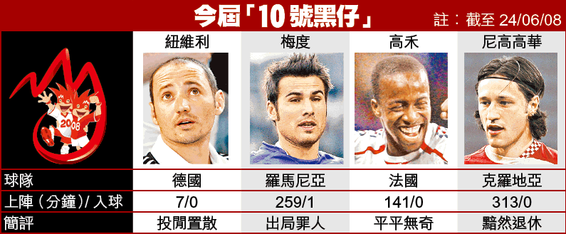 梅度與高禾兩名「10號仔」在死亡之組互撼,梅度對意大利取得入球原本成為球隊的功臣,可惜因射失12碼而受盡抨擊,成為最倒楣的「10號仔」;高禾背負施丹留下來的「10號」,顯然又是「被屈」穿上「10號」的一個例子,然而高禾在分組賽3場全無表現兼沒有一場踢足全場,其表現比里昂時更差,更遑論有法國「10號」的水準。