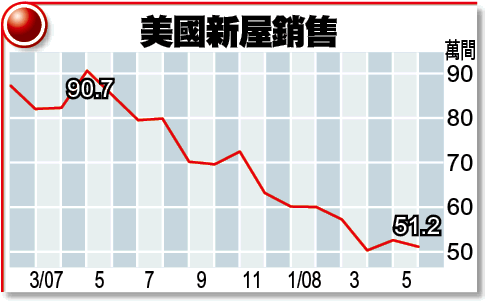 基於樓價下跌、按息上升及借貸標準收緊,美國5月份新屋銷售跌2.5%,以年率降到51.2萬間,但跌幅較預期的2.7%輕微。Wachovia高級經濟師維伊納相信,樓價會隨着經濟放緩而繼續下調,令有意置業者較難申請按揭,因此新屋銷售難以回升。