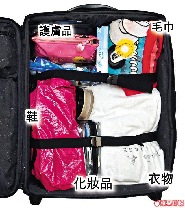 有年多飛行經驗的空姐翠儀,原來執行李是一味靠「袋」。「我用環保袋袋衫褲內衣,鞋用膠袋,全部放在篋底;篋頂放清潔用品、護膚品等易爛物件,袋與袋的空位則攝化妝品。篋前後的細袋可放遮或日常用物品。」