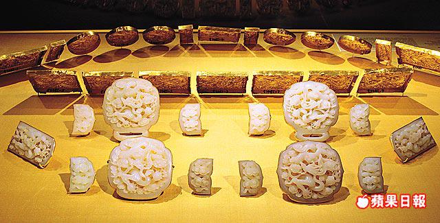 展覽分別以七個主題在三個展廳中展出,講述皇權及宮廷等級的主題中,有首次在海外展出的黃雲龍花卉攆龍袍,這件還未有縫製的龍袍,織繡精巧,是倪明昆籌備展覽時,由故宮人員翻開木箱後發現的。幾枚給貴族佩戴的白玉,包括在南京出土的龍雲帶十四塊,白玉流光,雕工精細。
