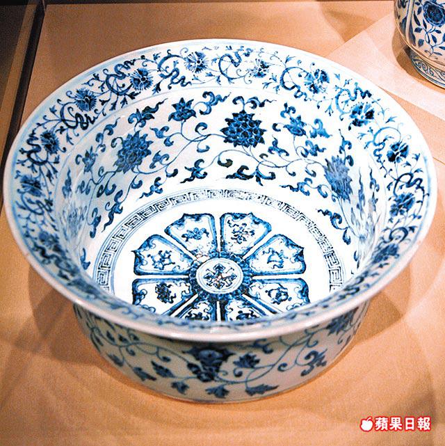 何鴻毅最欣賞展覽中的瓷器,他說明代江西景德鎮青花瓷器所用的土質比宋朝的更白,加上藍色花紋圖案效果更佳。這類展品包括有永樂年間製的八寶花卉紋淨盆及纏枝花卉紋花澆。