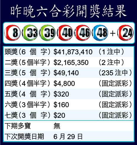 昨晚攪出號碼為8、33、39、40、46、48及特別號碼24號,頭獎一注中,每注派4,187萬,比馬會事前標榜有4,300萬,縮水了百餘萬,二獎兩注中,每注派216萬。本年六合彩最高頭獎彩金紀錄於4月13日締造,一位幸運兒於尖沙嘴漢口道投注站購入彩票,結果命中頭獎獲得5,061萬,是六合彩歷史上第七大頭獎彩金得主。
