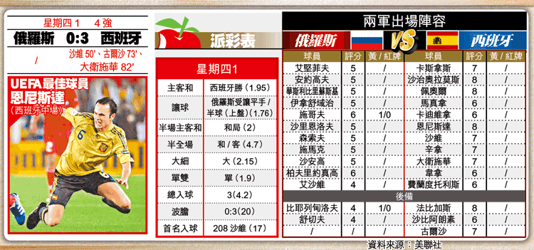 簡報 是役在大雨中進行,8強技驚四座的俄羅斯大失水準,面對剋星西班牙表現一籌莫展,慘吞對方3蛋。個人技術較佳的西班牙成功控制比賽節奏,先由沙維接應恩尼斯達妙傳打開紀錄。領先1球的西班牙越踢越順,比賽末段由法比加斯作出兩次致命傳送,分別由古爾沙和大衛施華射入,替球隊鎖定3:0勝局。 好睇指數:★★★ 註:以5★為最高
