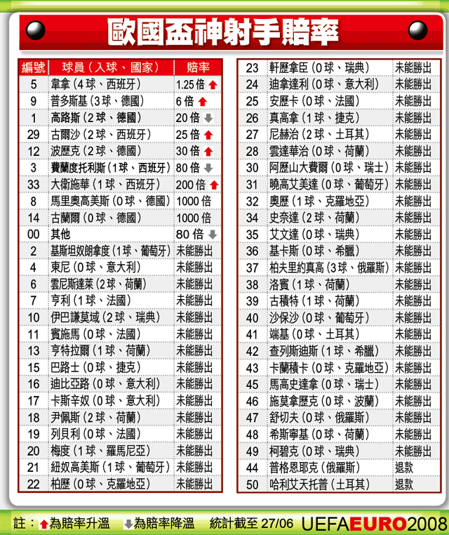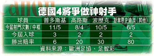 另外,高路斯和波歷克亦是落後韋拿兩球,要後上亦不是沒可能。由於決賽對手為身材偏矮的西班牙,故他們的身高優勢可佔甜頭。而筆者則最為看好「小豬」舒韋恩史廸加,集速度與技術一身的「小豬」停賽復出後表現光芒四射,連續2仗取得入球,是德國隊中的一大武器。「小豬」屬於「其他」類別,現時「其他」賠率高達80倍,極好分頭,絕對可以小注一試。