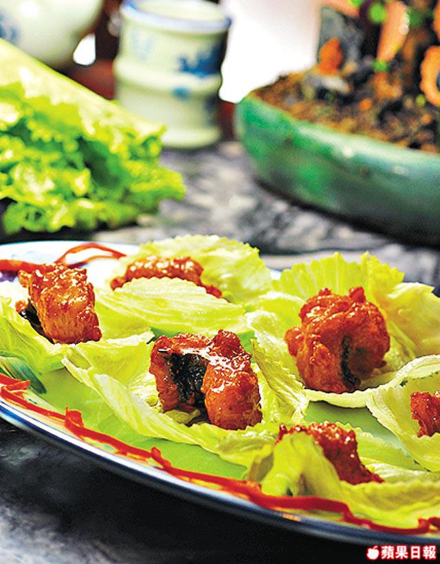 新鮮游水大白鱔去骨,加配料打成球狀,落鑊泡兩泡再搽蜜糖,用生菜包住食,一啖一個好香甜,好有嚼勁。