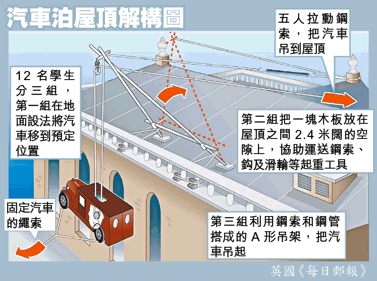 1958年6月一個早上,劍橋大學師生一覺醒來,發現一輛汽車泊在評議會大樓屋頂,當局事後出動警察、消防員及民防隊,花了約一周才把車吊下來。