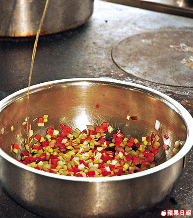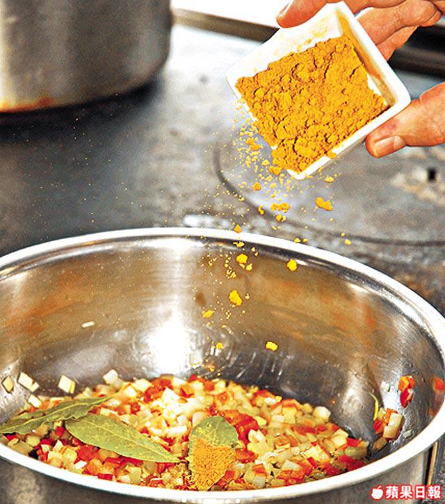 1.燒熱鍋開大火煮溶牛油,爆香洋葱、大蒜、蒜茸、西芹碎及紅蘿蔔拌勻,下香葉、黃薑粉、小茴、肉桂粉及蘭度豆炒5分鐘。