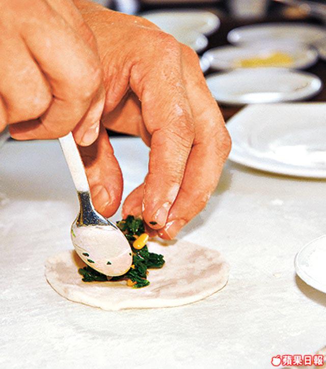 4.將粉糰分成小份,搓成薄皮,放上餡料後包成角形。